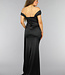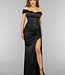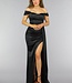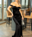 Schwarzes Satin schulterfreies Galakleid mit Schlitz