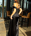 Dieses lange Kleid ist aus einem Satinstoff gefertigt. Das Kleid hat ein schulterfreies Design und fällt bis zum Knöchel. Das Kleid hat vorgeformte Cups, die das Tragen eines BHs überflüssig machen, der rutschfeste Rand hält das Kleid gut am Platz. Außerdem hat das Kleid einen hochgeschnittenen Schlitz und eine Korsettoptik an der Taille. An diesem Schlitz hat das Kleid ein plissiertes Extra-Detail. Das Kleid hat einen hohen Stretchanteil, wodurch es sehr angenehm zu tragen ist. Durch den verdeckten Reißverschluss auf der Rückseite lässt sich das Kleid leicht an- und ausziehen.