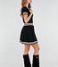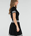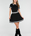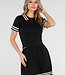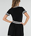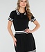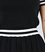 Dieses Set besteht aus einem eng anliegenden Oberteil und einem passenden Plisseerock in schlichtem Schwarz. Das Oberteil hat kurze Ärmel, einen festen Polokragen und Knopfverschlüsse auf der Vorderseite. Sowohl der Kragen als auch die Ärmelenden sind mit dezenten horizontalen Streifen verziert. Der Rock hat einen elastischen Bund und eine Plissee-Struktur mit Streifenakzenten entlang des Saums. Der Stoff hat eine feine Strickstruktur und ist dehnbar.