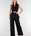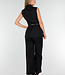 Dieses schwarze Set besteht aus einem ärmellosen Oberteil und einer passenden Hose mit weitem Bein. An der Taille befindet sich ein schwarzer Gürtel mit einer großen goldfarbenen Schnalle in Form einer organischen Blume. An beiden Seiten befinden sich kleine Klappendetails. Die Hose hat einen hohen, glatten Bund und gerade, weite Hosenbeine.