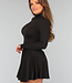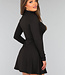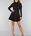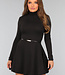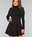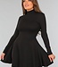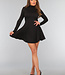 Dieses Kleid ist aus einem Stretch-Stoff gefertigt. Es hat einen hohen Rollkragen und lange Ärmel. Das Kleid hat einen Skater-Stil und fällt bis zur Mitte der Oberschenkel. Es hat keinen Reißverschluss, aber durch den Stretchanteil lässt es sich leicht anziehen. Das Kleid wird durch den Schlitz im Rock abgerundet.