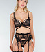 Dieses Dessous-Set ist aus schwarzer Spitze mit transparenter Struktur und feinem Blumenmuster gefertigt. Das Set besteht aus einem Bügel-BH, einem Slip und einem Strumpfgürtel. Der BH ist mit Bügeln für zusätzlichen Halt ausgestattet und hat verstellbare Träger mit kleinen Schleifendetails. Der Slip hat eine figurbetonte Passform und ist komplett aus Spitze gefertigt. Der Strumpfgürtel wird separat über dem Slip getragen und ist mit Strumpfhaltern ausgestattet. Alle Teile sind aus elastischer Spitze gefertigt.