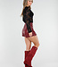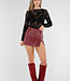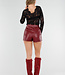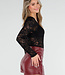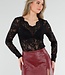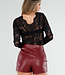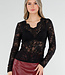 Schwarzes Spitzenoberteil mit langen Ärmeln und transparentem Stoff. Der Stoff ist elastisch. Das Oberteil kann auf zwei Arten getragen werden: mit hohem Ausschnitt vorne und offenem Rücken oder mit V-Ausschnitt und geschlossenem Rücken.