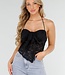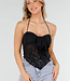 Dieses schwarze Neckholder-Top ist aus leicht durchscheinender Stretch-Spitze mit zarter floraler Struktur gefertigt. Es hat einen Neckholder-Verschluss mit dünnen Trägern und eine Schleife auf der Vorderseite. Das Oberteil besteht aus einem blickdichten Teil mit Pads, während der untere Teil transparent ist. Das Oberteil fällt etwas kürzer und endet unten in einer Spitze.