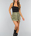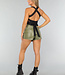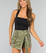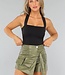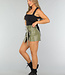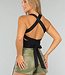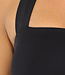Dieses schwarze Stretch-Sporttop hat einen quadratischen Ausschnitt und breite Schulterträger. Auf der Rückseite hat es gekreuzte Träger, die in einer Schleife enden. Das Top hat herausnehmbare weiche Pads, so dass das Tragen eines BHs nicht notwendig ist.