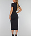 Dieses Midikleid ist in zeitlosem Schwarz gehalten und hat eine eng anliegende Passform. Das Kleid ist aus einem glatten Stretch-Stoff gefertigt, der sich eng an den Körper schmiegt und Ihre Figur perfekt betont. Das Modell hat kurze Ärmel, einen Rundhalsausschnitt und fällt bis zur Mitte der Wade, das Kleid hat aufgrund des hohen Stretchanteils keinen Schlitz am Rücken. Der Stoff hat einen subtilen Schimmer. Der Rücken ist hochgeschlossen und enthält keine sichtbaren Verschlüsse oder Details, das perfekte Basic!