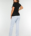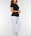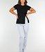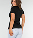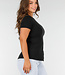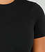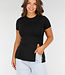 Dieses schwarze Oberteil ist aus einem Stretch-Material gefertigt, das sich dem Körper anpasst und eine eng anliegende Passform bietet. Das Oberteil hat kurze Ärmel, einen Rundhalsausschnitt und einen Schlitz auf der Vorderseite. Dank des dehnbaren Stoffes bleibt das Oberteil bequem und formstabil. Perfekt für einen lässigen Look oder einen eleganten Anlass.