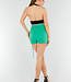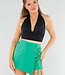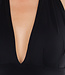 Das Oberteil ist in Schwarz gehalten und hat einen Neckholder-Schnitt. Auf der Vorderseite ist der Ausschnitt tief V-förmig geschnitten. Das Top ist tailliert und fällt knapp über die Taille. Unterhalb der Brust befindet sich ein breiter Gummizug, der für einen festen Sitz sorgt. Der Stoff hat eine glatte, dehnbare Textur mit leichtem Schimmer. Der Rücken ist komplett offen und wird nur durch ein Band am unteren Rand gestützt.