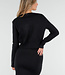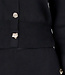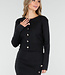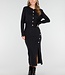 Dieses Set besteht aus einer schwarzen, fein gestrickten Strickjacke und einem passenden Rock. Die Strickjacke hat lange Ärmel und wird vorne mit auffälligen Knöpfen in Goldfarbe geschlossen. Der Rock hat eine figurbetonte Passform und reicht bis zur Mitte der Wade. Auf der Vorderseite befindet sich ein hoher Schlitz, der mit den gleichen Knöpfen wie das Oberteil verziert ist. Beide Teile sind aus einem elastischen Stoff gefertigt, der sich geschmeidig um den Körper legt.