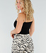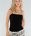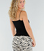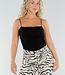 Dieses schwarze Oberteil ist aus einem glatten, dehnbaren Stoff gefertigt und liegt eng am Körper an. An den Seiten ist ein leicht geraffter Effekt eingearbeitet, der für dezente Falten und eine schmeichelhafte Passform sorgt. Der gerade Ausschnitt ist mit dünnen Spaghettiträgern versehen, und auf der Innenseite sind Pads eingearbeitet, die für zusätzliche Abdeckung sorgen. Der Stoff lässt sich gut dehnen, so dass das Top angenehm zu tragen ist.