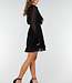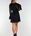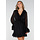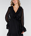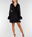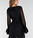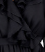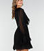 Dieses Kleid ist aus einem schwarzen Chiffon-Stoff mit dezenter Textur. Die langen Ärmel sind mit einem Gummizug und breiten Volantbündchen mit Spitzenbesatz versehen. Das Kleid wird mit einem Schleifengürtel in der Taille geschlossen und hat ein überspringendes Design mit Rüschen entlang des Ausschnitts und des Saums. Die Innenseite ist gefüttert, die Ärmel sind leicht durchsichtig.