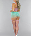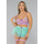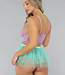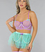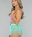 Alle Teile sind aus Mesh gefertigt und schimmern daher durch. Der BH hat Bügel. Am Rücken gibt es keinen Hakenverschluss, aber das Oberteil lässt sich dank des Stretchanteils leicht anziehen. Die Schulterträger sind fest, aber verstellbar. Der Rock hat eine Tülloptik und kann am Rücken mit einem Hakenverschluss geschlossen werden. Unter dem Rock können Sie den mitgelieferten String tragen und das Set enthält auch Netzstrümpfe.