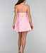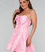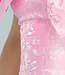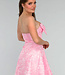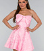 Dieses elegante trägerlose Kleid in zartem Rosa ist perfekt für jeden festlichen Anlass. Das Kleid ist aus einem luxuriösen Stoff mit schimmerndem Damastdruck gefertigt, der wunderschön fällt und einen dezenten Glanz aufweist. Das auffällige Schleifendetail auf der Vorderseite verleiht ihm einen verspielten Charme. Der Rock ist fließend und schwungvoll, so dass Sie sich frei bewegen können. Das Kleid hat einen verdeckten Reißverschluss auf der Rückseite, der für einen nahtlosen Look sorgt. Perfekt zu kombinieren mit eleganten Accessoires für einen kompletten Look. Das Kleid ist oben mit einem Silikonband versehen, damit es nicht verrutscht.