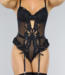 Dieses wunderschöne Spitzen-Dessous-Set hat vorgeformte Cups. Das Set hat außerdem süße Rüschen und Spitzendetails. Das Dessous-Set hat verstellbare Spaghetti-Träger und einen Hakenverschluss am Rücken, der aus zwei Haken besteht, die in drei Positionen eingestellt werden können. An dem Dessous-Set sind feste Strapse angebracht, die Sie einfach an den Strümpfen befestigen können.