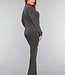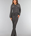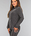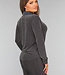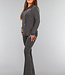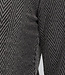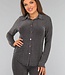 Diese Bluse ist aus einem feinen Stretch-Stoff gefertigt. Sie hat lange Ärmel und einen Kragen. Auf der Vorderseite befindet sich ein Knopfverschluss, der aus sechs goldenen Knöpfen besteht. Der Stoff des Oberteils ist mit einem glitzernden Zickzack-Muster verziert.