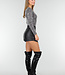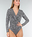 Dieser silberne Body ist vollständig mit Pailletten bedeckt und hat einen überlappenden V-Ausschnitt. Der Body hat lange Ärmel und eine figurbetonte Passform. Der untere Rand ist hoch ausgeschnitten und die Rückseite ist glatt verarbeitet.