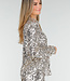 Diese silberne Bluse ist vollständig mit glänzenden Pailletten verziert, die für einen auffälligen Glanz sorgen. Das Modell hat einen klassischen Kragen und lange Ärmel für einen zeitlosen, eleganten Look. Die gerade Passform fällt locker und macht die Bluse ideal für festliche Looks. Ein echter Hingucker, der perfekt zu einer Paillettenhose oder einem Paillettenrock passt.