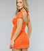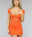Dieses schöne orangefarbene Kleid hat eine schöne taillierte Form, die Ihrer Figur schmeichelt. Das Kleid hat kurze, durchsichtige Ärmel. Darüber hinaus hat das Kleid einen herzförmigen Ausschnitt. Außerdem ist das Kleid aus einem Spitzenstoff gefertigt und hat niedliche Plissee-Details. Auf dem Rücken befindet sich eine Schleife.