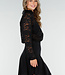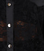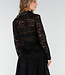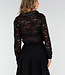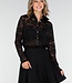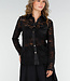 Diese Bluse ist aus schwarzer Spitze mit floralem Muster gefertigt und durchsichtig. Sie hat lange Ärmel, einen klassischen Kragen und eine Brusttasche und ist aus glänzendem Satin gefertigt. Die Vorderseite lässt sich mit goldfarbenen Knöpfen schließen und die Passform ist gerade und leicht locker.