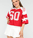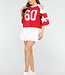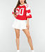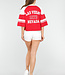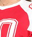 Dieses sportliche rote Baseball-T-Shirt ist eine perfekte Ergänzung für Ihre Garderobe. Es ist aus einer weichen und atmungsaktiven Baumwollmischung gefertigt, die sich angenehm auf der Haut anfühlt und leicht dehnbar ist. Das Shirt hat geräumige, weiße Ärmel, die eine verspielte Note verleihen. Auf der Vorderseite befindet sich eine große Zahl sechzig und auf den Ärmeln ein Sternenmuster. Perfekt zu Jeans für einen lässigen Look.