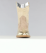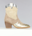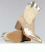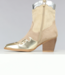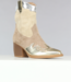 Diese Cowboystiefel in Wildlederoptik haben eine stilvolle spitze Spitze und einen schrägen Blockabsatz in Holzoptik. Man muss von oben einsteigen und da der Schaft etwas breiter ist, geht das ganz einfach. Die Stiefel schließen oben ab und sind mit goldenen und silbernen Metallic-Details versehen.
