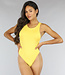 Dieser feine Body ist aus einem elastischen Stoff gefertigt. Der Body hat einen hohen Kragen und unten einen Druckknopfverschluss, der aus zwei Druckknöpfen besteht, die Sie in eine Position bringen können.