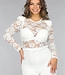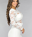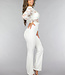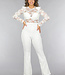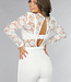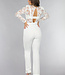 Dieser Jumpsuit ist dehnbar und hat einen geraden Beinausschnitt. Das Oberteil besteht aus einem Spitzenstoff und ist durchsichtig. Auf der Rückseite hat er einen offenen Ausschnitt mit einem einzigen Knopfverschluss am Halsausschnitt. Der Jumpsuit hat lange Ärmel mit Schulterpolstern an den Schultern. Um die Taille befinden sich zwei Schlaufen, durch die man den passenden Gürtel tragen kann.