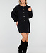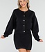 Dieses schwarze 2-teilige Set besteht aus einer Strickjacke und einem passenden Rock. Die Strickjacke hat einen Rundhalsausschnitt, lange Ärmel und glänzende Knöpfe auf der Vorderseite. Außerdem sind zwei große aufgesetzte Taschen auf der Vorderseite zu sehen. Der Rock ist kurz geschnitten, figurbetont und hat einen elastischen Bund, der für einen bequemen Sitz sorgt. Beide Teile sind aus einem weichen Strickstoff gefertigt und haben dezente Ziernähte an den Seiten. Das Set kann sowohl zusammen als auch separat getragen werden.