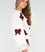 Diese cremefarbene Strickjacke hat eine lockere Passform und abgesenkte Schulternähte. Die Vorderseite hat einen V-Ausschnitt und wird mit drei bordeauxfarbenen Knöpfen geschlossen. An der gesamten Strickjacke sind große bordeauxfarbene Schleifen aus demselben grobmaschigen Strickmaterial angebracht. Die Ärmel sind lang und leicht ballonförmig, mit einem breiten Rippstrick-Besatz am unteren Ende.