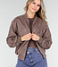 Diese taupefarbene Bomberjacke hat einen klassischen, kurzen Schnitt mit einem geraden Reißverschluss vorne und einem Stehkragen. Die gerippten Bündchen an den Ärmeln und am Saum sorgen für eine bequeme Passform und verleihen der Jacke einen sportlichen Look. Der Stoff hat eine weiche, matte Textur und fällt geschmeidig um den Körper.