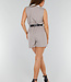 Dieser ärmellose Playsuit ist in Taupe gehalten und hat einen auffälligen weißen Reverskragen im Blazer-Stil. Er hat einen tiefen V-Ausschnitt und einen schwarzen Gürtel in der Taille, der Ihre Figur umwerfend aussehen lässt. Die Shorts sind locker geschnitten und haben Taschen und Plissee-Details auf der Vorderseite. Der Stoff ist glatt und strapazierfähig. Die Rückseite ist ganz schlicht und hat einen elastischen Bund.