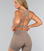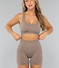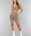 Dieses Sport-Set ist aus einem sehr hochwertigen Stoff gefertigt. Der Stoff ist dehnbar, bietet aber auch Kompression in den Bereichen, wo es nötig ist. Der Stoff ist herrlich weich und enorm atmungsaktiv. Der Sport-BH hat einen runden Ausschnitt mit breiten Trägern und herausnehmbaren Polstern. Der Rücken ist gekreuzt und hat in der Mitte einen Ausschnitt. Die Shorts des Sets haben eine hohe Taille und einen Knitter auf dem Rücken.