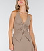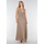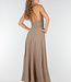 Dieses taupefarbene Set besteht aus einem Neckholder-Top mit tiefem V-Ausschnitt und festem Knopf auf der Vorderseite, kombiniert mit einem langen Rock aus demselben dehnbaren Stoff. Das Oberteil wird am Hals mit Schleifen geschlossen und lässt den Rücken weitgehend offen. Der angeschlossene Rock fällt weit. Der elastische Stoff sorgt für einen festen und bequemen Sitz.
