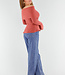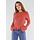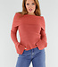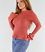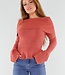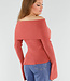 Dieser terrakottafarbene Pullover ist in einem feinen Rippenmuster gestrickt und hat einen schulterfreien Ausschnitt, der gerade über die Schultern verläuft. Er ist leicht tailliert und läuft nach unten hin in eine dezente Schößchenform aus. Die langen Ärmel haben einen breiten, ausgestellten Saum, der über das Handgelenk fällt. Der Stoff ist dehnbar und liegt angenehm an. Der Halsausschnitt hat einen breiten, umgeschlagenen Saum.