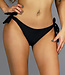 Dieser trendige Bikini ist einfarbig schwarz. Das Oberteil ist vorgeformt und hat einen leichten Push-up-Effekt. Es verfügt über einen Neckholder, den Sie im Nacken binden müssen, und auf der Rückseite befindet sich ein Hakenverschluss. Vom Oberteil verlaufen zwei Bänder unterhalb der Brust zum Rücken, wo sie zusammengebunden werden. Dies ist eine Art Wickeloptik. Das Höschen hat eine normale Passform und an beiden Seiten einen Schnürverschluss. So lässt sich das Höschen leicht anpassen.