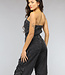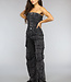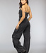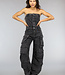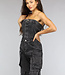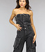 Dieser coole Jumpsuit hat einen trägerlosen Schnitt. Der Jumpsuit ist grau und hat eine leichte Waschung. Die Unterseite des Jumpsuits hat viele Cargotaschen. Der Overall ist dank des Knopfverschlusses einfach anzuziehen. Der Knopfverschluss besteht aus sieben Knöpfen, darunter befindet sich ein Reißverschluss.