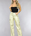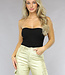 Dieses trägerlose Oberteil ist aus weichem und dehnbarem Rippstoff gefertigt. Das Oberteil hat einen herzförmigen Ausschnitt und ein plissiertes Kräuseldetail verläuft über den Bauch. Das Oberteil ist trägerlos und hat daher keine Ärmel. Das Oberteil hat jedoch eine eingearbeitete Polsterung, die das Tragen eines BHs überflüssig macht.