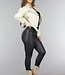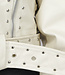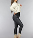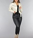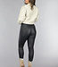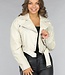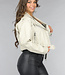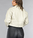 Diese Jacke in Lederoptik ist kurz geschnitten. Sie hat einen umgeschlagenen Kragen und lange Ärmel, ist mit einem silbernen Reißverschluss versehen und hat zwei Reißverschlusstaschen. An der Unterseite der Jacke befindet sich ein Gürtel mit Schnalle. Die Jacke ist mit vielen silbernen Nieten besetzt.