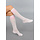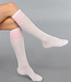 Diese Socken reichen bis unter das Knie und sind aus einem dehnbaren Stoff gefertigt. Sie sind weiß und haben oben drei blassrosa Streifen.