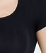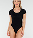 Dieser superweiche schwarze Body ist aus einem Stretch-Stoff gefertigt und hat eine enge Passform. Er hat kurze Ärmel und einen Rundhalsausschnitt. Die Ärmel sind tailliert. Der Body sitzt wie ein Tanga-Modell und wird mit Druckknöpfen geschlossen. Dank des Stretchmaterials liegt der Stoff eng am Körper an.