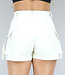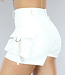 Die Shorts sind aus einem schönen weißen Lederstoff gefertigt. Die Shorts sind extrem robust und perfekt für ein Festival wegen der großen Taschen, wo Sie alles setzen können. An der Taille ist die Hose etwas schmaler, so dass sie gut sitzt. Die Shorts haben auch Schlaufen, so dass ein Gürtel getragen werden kann.