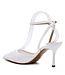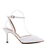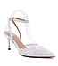 Diese weißen Pumps haben eine spitze Zehenpartie und einen schlanken hohen Absatz. Das Obermaterial ist vollständig mit Perlen, Pailletten und Strasssteinen verziert. Die Pumps haben ein Fesselband mit verstellbarer Schnalle. Das Modell ist an der Ferse offen und vorne geschlossen.