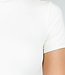 Dieser weiße Stringbody ist aus einem glatten, dehnbaren Stoff gefertigt und hat eine eng anliegende Passform. Das Modell hat kurze Ärmel und einen Rundhalsausschnitt. Der Body hat ein schlichtes Design und keine sichtbaren Details oder Verschlüsse auf der Vorderseite. Der untere Teil ist als String ausgeführt und wird mit Druckknöpfen geschlossen.