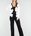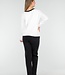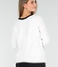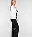 Dieser weiße Cardigan ist aus Strickstoff gefertigt und hat eine auffällige Verarbeitung mit schwarzen Details. Das Modell hat einen tiefen V-Ausschnitt und wird vorne mit zwei großen weißen Schleifen geschlossen. Die langen Ärmel sind gerade geschnitten und fallen locker am Körper entlang.