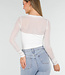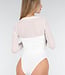 Dieser Body ist aus transparentem weißem Mesh-Stoff gefertigt und hat eine figurbetonte Passform. Das Modell hat einen geraden Ausschnitt und lange, figurbetonte Ärmel aus Mesh, die vollständig transparent sind. Der Körper des Bodys ist mit einem festen Korsettfutter mit Bügeln und verstärkten Stäbchen ausgestattet, was für zusätzlichen Halt und eine schön geformte Silhouette sorgt. Dadurch ist das Material am Körper bedeckend und fest. Der untere Teil ist wie ein Body verarbeitet, sodass das Modell fest in der Hose sitzt. Der Body wird unten mit drei Druckknöpfen geschlossen.
