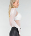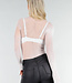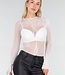 Dieser Body ist aus weißem Mesh-Material mit einer offenen Fischnetzstruktur und einem durchgehenden Schlangenprint gefertigt. Das Modell hat eine figurbetonte Passform und lange Ärmel. Der Ausschnitt ist hoch und rund, und der untere Teil ist wie ein Body verarbeitet. Das Material ist vollständig transparent und besteht aus einem feinen Fischnetzmuster mit Schlangenmotiv, das über den Oberkörper, die Arme und die Hüften sichtbar ist. Der Bodysuit hat keinen Verschluss an der Unterseite, lässt sich aber dank der Dehnbarkeit des Materials leicht an- und ausziehen.