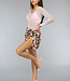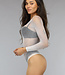Dieser Body hat ein Netzmuster und ein schulterfreies Design. Der Body ist mit einem Netzmuster und Glitzersteinen versehen. Der Body ist tailliert und weiß. Außerdem verfügt der Body über lange Ärmel und ein Tanga-Modell. Der Body hat unten keinen Verschluss, lässt sich aber dank des Stretchanteils leicht an- und ausziehen.