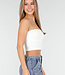 Dieses Bandeau-Crop-Top ist aus weißem, elastischem Rippstoff gefertigt und mit Polstern versehen. Das Modell ist ärmellos und hat einen geraden, trägerlosen Ausschnitt. Das Top hat eine figurbetonte Passform und endet oberhalb der Taille.