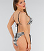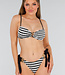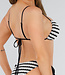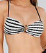 Dieses weiß-schwarze Triangel-Bikinioberteil ist aus einem Stretch-Stoff mit horizontalen Streifen. Zwischen den Cups ist ein goldfarbenes Koru-Symbol eingearbeitet. Das Oberteil hat herausnehmbare Pads, verstellbare Träger und einen Schleifenverschluss am Rücken.