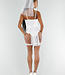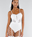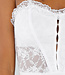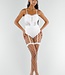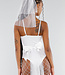 Dieses weiße Braut-Dessous-Set besteht aus einem Body mit Strumpfhaltern, einem Netzstrumpfhosen und einem kleinen Schleier mit Haarspange. Der Body ist aus Spitze mit Satin-Einsätzen gefertigt. Der obere Teil des Bodys ist mit einer schmalen Spitzenborte verziert. Der Body wird unten mit Druckknöpfen geschlossen. Das Set wird komplett mit einem kurzen Schleier aus Mesh geliefert, der an einer Metall-Haarspange befestigt ist.